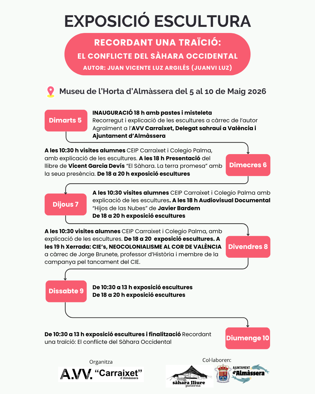 Organitzat per l’Associació de Veïns i Veïnes Carraixet d’Almàssera i en col·laboració amb l’Ajuntament d’Almàssera i l’Associació Sàhara Lliure de Paterna, estes obres es poden visitar ara a Almàssera, al Museu de l’Horta (Av. de la Mar 24) del 5 al 10 de maig. Horari de 18 a 20 h els dies 5, 6, 7, 8 i 9 i de 10,30 a 13 els dies 9 i 10.